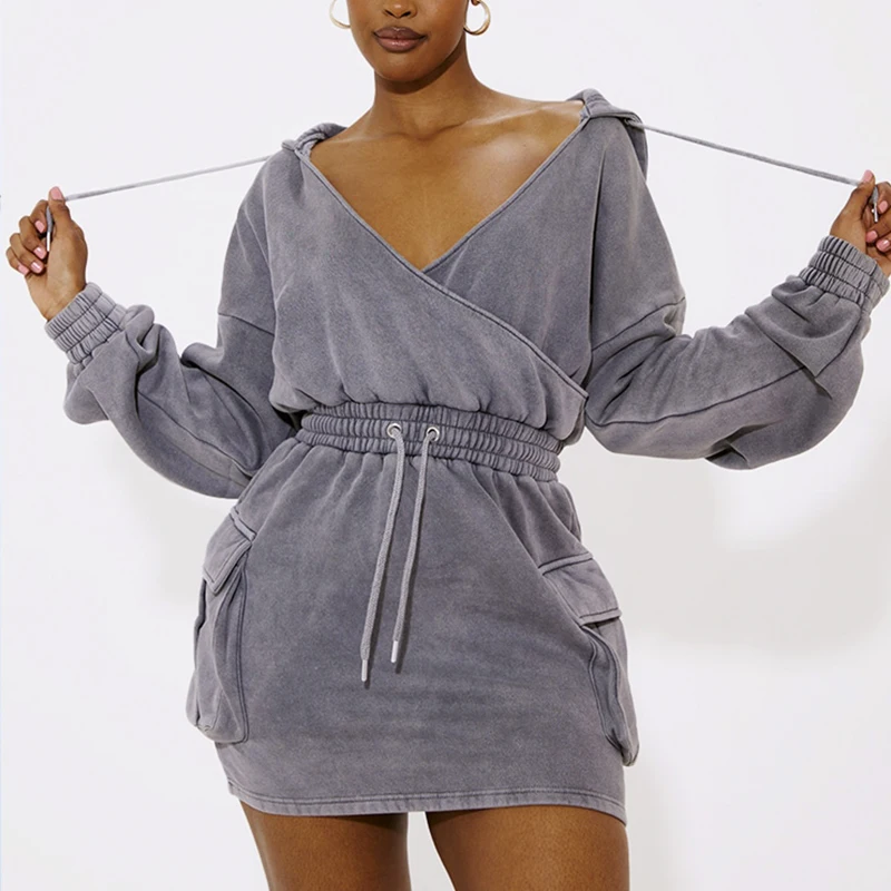 Huilong Manufacturer's Vintage Acid Wash Cotton Hoodie Dress for Women High Quality Long Sleeve Dress Custom Logo Y2K Washable